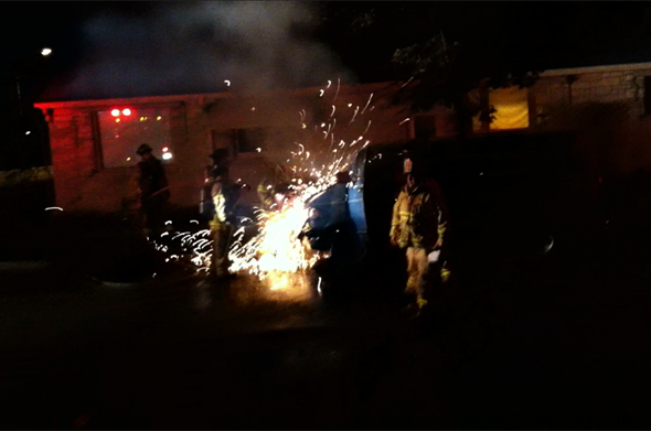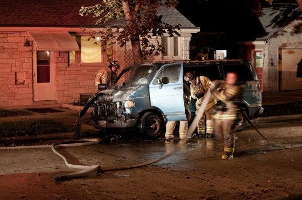 I was in the kitchen tonight and heard several obnoxiously frequent blows of a car horn. I looked out to scowl at the jerk making all the noise, but saw flames erupting from under the hood of this van. I think the honking was from a passing car.(?) I hastily made my way outside (I wouldn’t say I ran. But it was more than a brisk walk, less than a jog). I didn’t see anyone around the van and the inside was completely veiled in smoke. I rapped on the driver’s window and a guy yelled from across the street to tell me that nobody was in there. (He was the owner, and was driving down out street when it caught on fire.) By now the flames were about level with the top of the van, but still only emanating from under the hood and wheel wells. I ran to the backyard and started unreeling the hose, which the owner of the van grabbed and begun spaying it from 30 feet away. It couldn’t have taken more than 30 seconds to run to the hose, unreel it, and start spraying, but the flames were 10-12 feet high now and had made their way into the passenger compartment. It was also at this point that one of the tires popped, which was startling to say the least. The owner had the hose on the van for less than a minute, when the fire fighters arrived. As I’m sure you aware, the garden hose had no effect on the fire. The fire fighters on the other hand, had it out in seconds. From there, they proceeded to cut a section of the hood off with a grinder so they could make sure everything was extinguished underneath. The lousy video below will look familiar to Brian because I install car stereos in much the same manner.