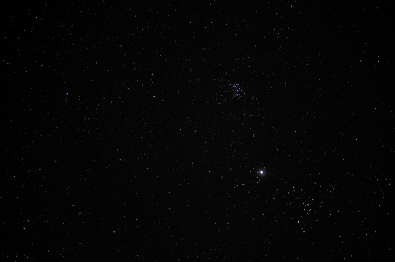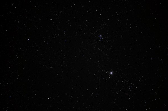 This is looking straight up. The bright one near the center-right is Jupiter, with the Pleiades star cluster above it.